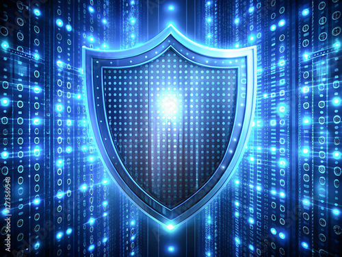 A cyber security shield with glowing binary codes, symbolizing digital protection and data encryption.