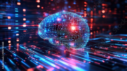 A cybernetic brain with digital circuits and light trails illustrating the rapid processing of data flow