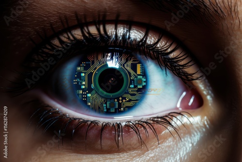 A cybernetic eye in close-up, highlighting its advanced technology and mechanical features.