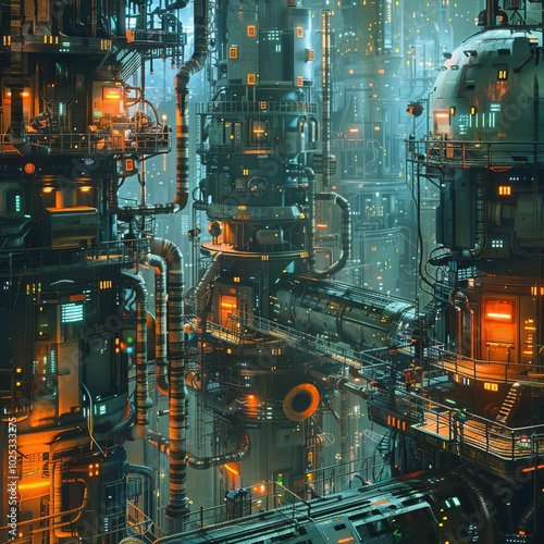 A cybernetic factory with robotic assembly lines and neon lights, in a hightech industrial area