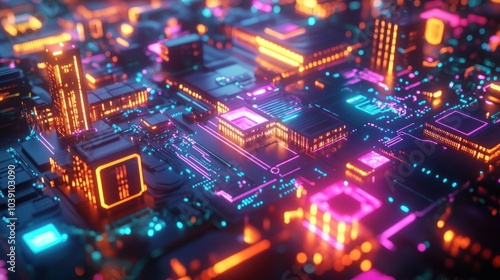 A cyberpunk cityscape built on a circuit board with neon lights.