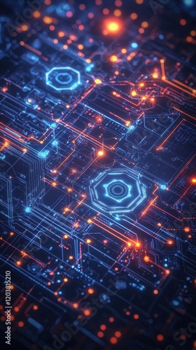A cyberpunk-style pattern of glowing hexagons connected by neon blue lines. Each hexagon contains a holographic symbol, creating a futuristic and tech-inspired seamless texture.