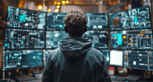 A cybersecurity professional monitors multiple screens filled with data visualizations and alerts, focusing on firewall settings and risk management strategies in a modern office environment.