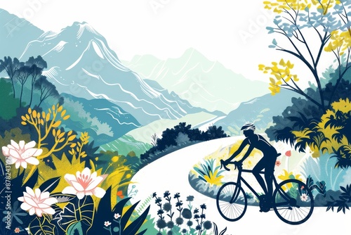 A cyclist rides on a winding path surrounded by lush greenery, promoting eco-friendly transportation. The serene atmosphere highlights the importance of reducing carbon footprint.