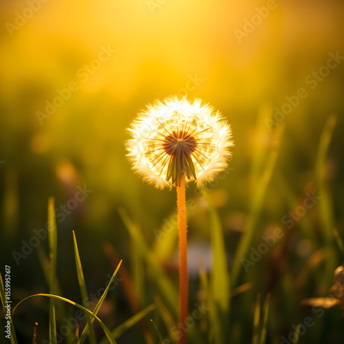 a dandelion puff glows with warm, golden light against a soft, blurred green background,