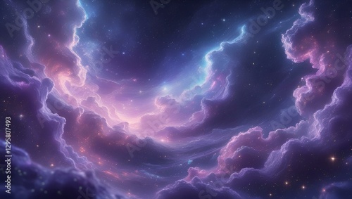 A dark, abstract space background with stars and clouds evokes a dramatic, stormy atmosphere