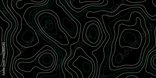 A dark, abstract topographic map or contour line pattern, with thin, contrasting white and green lines forming a complex, undulating design against a solid black background.