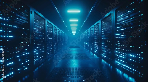A dark and mysterious data center. The blue lights of the servers are reflected on the floor. The atmosphere is cold and sterile.
