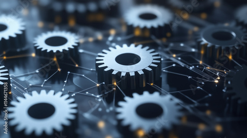 A dark background with detailed, interconnected gears showing a mechanical system at work.