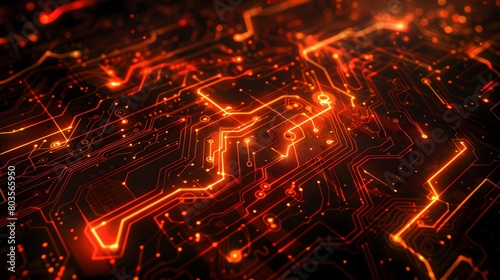 A dark background with glowing orange and red circuit lines, representing data flow in technology.