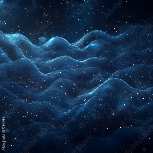 A dark blue background with glowing particles, featuring the shape of undulating clouds. The foreground features three-dimensional digital lines composed of luminous dots and small stars. A large area