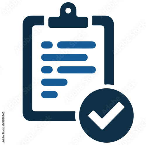 A dark blue clipboard with document and a check mark inside a circle on the bottom right side