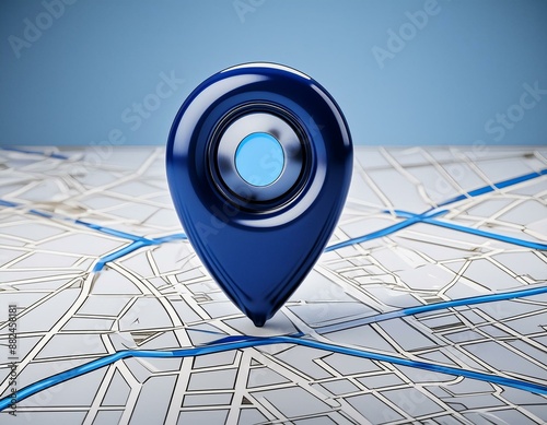 A dark blue location indicator on city map in 3D rendering. City map with a blue GPS location icon determining the exact meeting point.