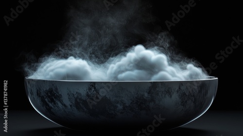 A dark bowl filled with swirling steam and clouds, creating a mysterious atmosphere in a minimalistic setting.