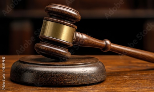 A dark brown wooden gavel rests on a matching sound block, poised on a rich wood surface