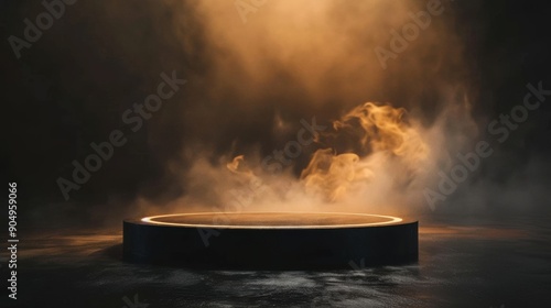 A dark circular product display with dramatic light beams and smoke, highlighting the showcase of a product