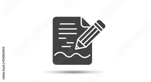 A dark gray icon of a document with lines and a pencil writing on it on a white background image