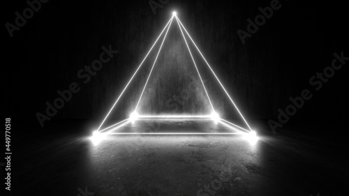 A dark hall lit by white neon lights. Reflections on the floor and walls. 3d rendering image.