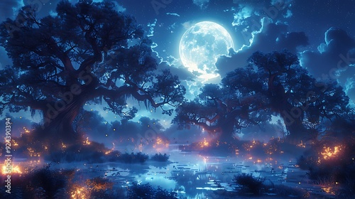 A dark, magical swamp with gnarled trees and glowing plants, eerie creatures hiding in the shadows, and dense fog rolling over the water, under a full moon, a vibrant and eerie cartoon style,