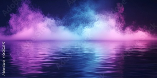 A dark, mysterious night scene with a water surface glowing neon. Smoke swirls above, while spooky white light shines from beneath the water. A misty fog adds to the eerie atmosphere.