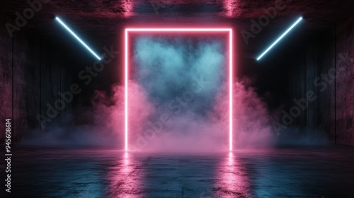 A dark room featuring a glowing neon frame with pink and blue smoke swirling inside, creating a futuristic and surreal atmosphere.