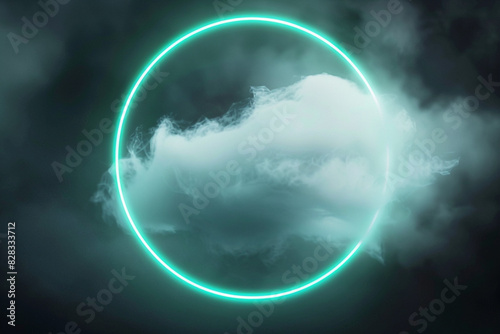 A dark sky 3D vertical frame featuring a swirling cloud lit by a mint green neon ring.