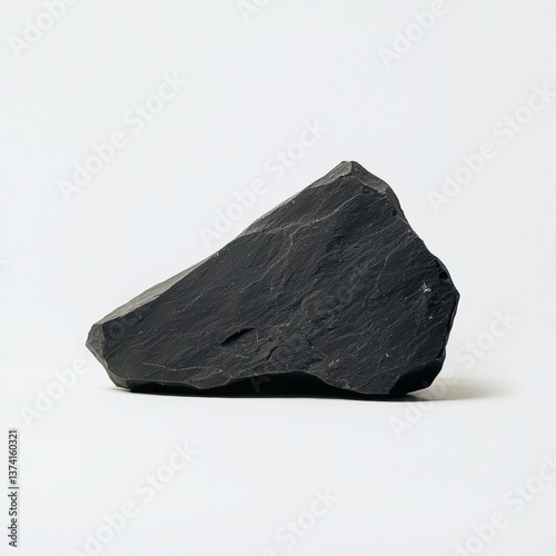 A dark, textured rock with angular shapes, set against a plain background, showcasing its natural beauty and unique geological features.