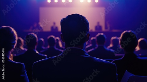 A darkened auditorium filled with audience members, focusing on a panel of speakers under bright stage lights.