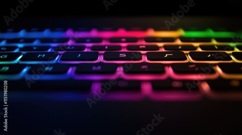 A dark-themed backlit keyboard with rainbow lighting, creating a futuristic tech vibe.