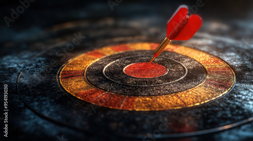 A dart is perfectly aimed at center of vibrant dartboard, symbolizing focus and precision in achieving goals.
