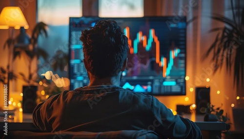 A day trader at home watching fluctuations in stock prices, reacting to changes with speed