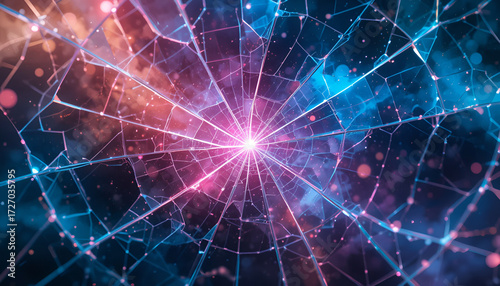 A dazzling abstract representation of a cosmic event or shattered reality, featuring a central bright light radiating outwards through fractured lines and colorful nebulae in shades of pink, blue, and