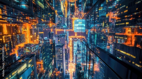 A dazzling city of mirrors, where buildings reflect light in myriad directions, crafting a stunning display of continuous reflections throughout the metropolis.