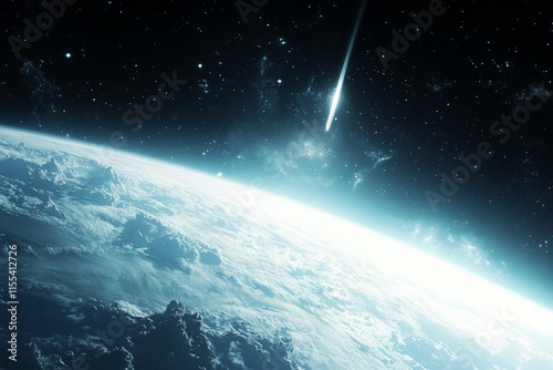 A dazzling meteor travels across the dark cosmos, contrasting boldly against the white surface of a distant planet, evoking the beauty and vastness of space.