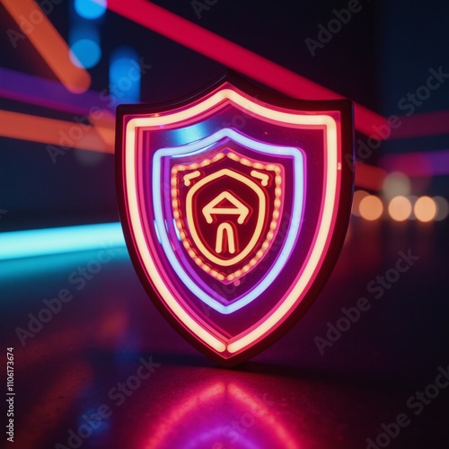 A dazzling neon shield evoking safety and shelter amidst an energetic pulsating backdrop