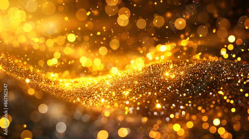 A dazzling visual of a golden wave pattern that scintillates with sparkle, embodying fluidity and a luxurious feel,Flowing abstract golden particles background with bokeh effect