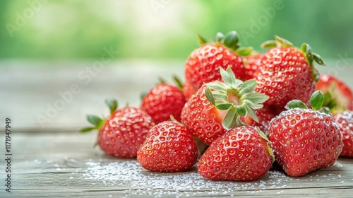 A decadent dessert consisting of freshly picked ripe strawberries spread out on a rustic wooden table, the vibrant red berries glistening under the soft lighting