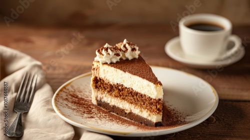 A decadent slice of tiramisu cheesecake with layers of mascarpone cheese, coffee-soaked ladyfingers