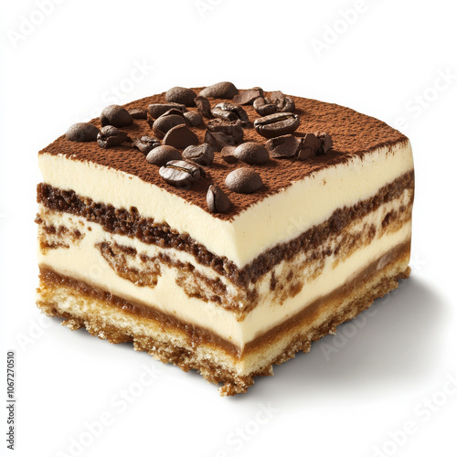 A decadent slice of tiramisu with layers of cream and coffee, isolated on a white background, showcasing rich dessert appeal