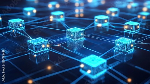 A decentralized ledger graphic with interconnected blocks glowing on a high-tech holographic interface