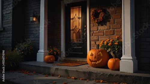 A decorated front porch with pumpkins, a wreath, and fall foliage.