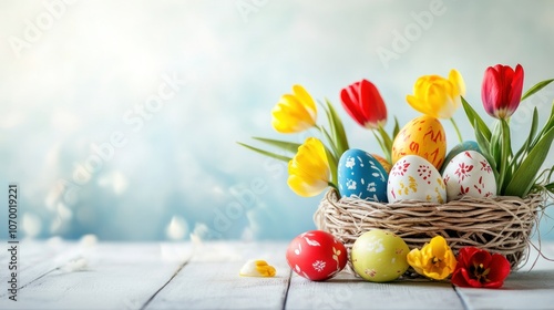 A decorative basket filled with colorful Easter eggs and vibrant tulips, celebrating spring.
