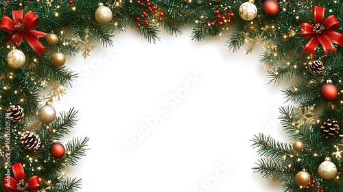 A decorative border of Christmas tree garlands with green pine, shiny baubles, and red ribbons, framing a white central area, soft lighting, festive and elegant, hd quality. --ar 16:9