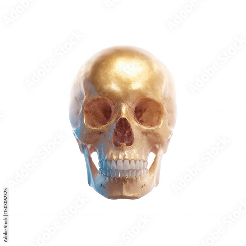 A decorative golden skull with intricate details, representing themes of mortality and art. The skull is presented on a white isolated background for clarity and focus.