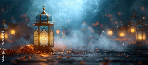 A decorative lantern surrounded by smoke and glowing lights, creating a mystical ambiance.