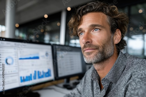 A dedicated professional studies analytics on computer screens, reflecting seriousness, determination, and the fast-paced world of data-driven decision-making in business.