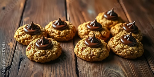A delectable arrangement of oatmeal cookies topped with rich chocolate kisses, resting on a rustic wooden surface.