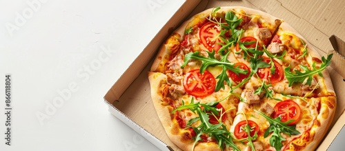 A delectable array of unhealthy yet delicious fast food items, like pizza with tomato, cheese, tuna, and greens, presented in an open cardboard box against a white studio background. Ample copy space