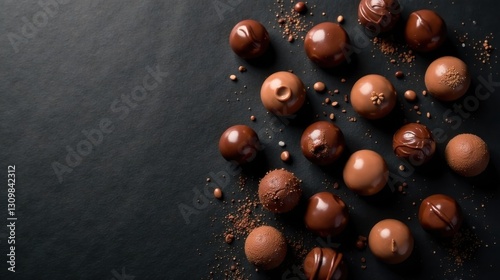 A delectable assortment of artisan chocolate truffles, artfully arranged on a dark surface, sprinkled with cocoa powder, showcasing a variety of textures and shades of brown.