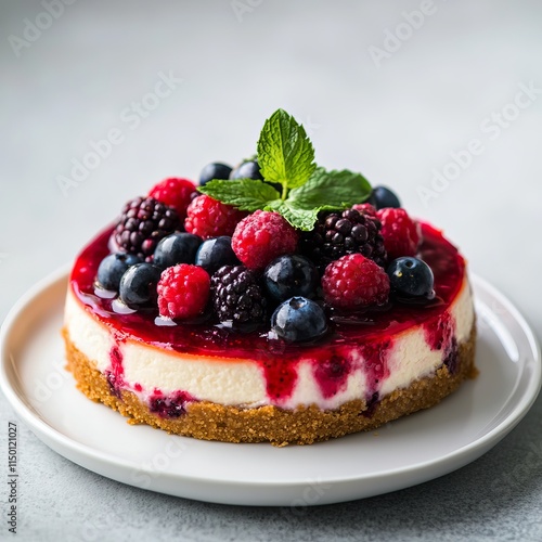 A delectable berry cheesecake with a graham cracker crust and a vibrant berry topping, served in a white dish, Berry cheesecake centered